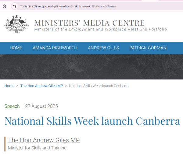 Read MoreSpeech Date:27 August 2025 National Skills Week launch Canberra Ministers: The Hon Andrew Giles MP Minister for Skills and Training Acknowledgements omitted It is a great pleasure to be here today as part of the launch of National Skills Week for 2025. It’s an opportunity to highlight how attractive a VET career pathway can be....